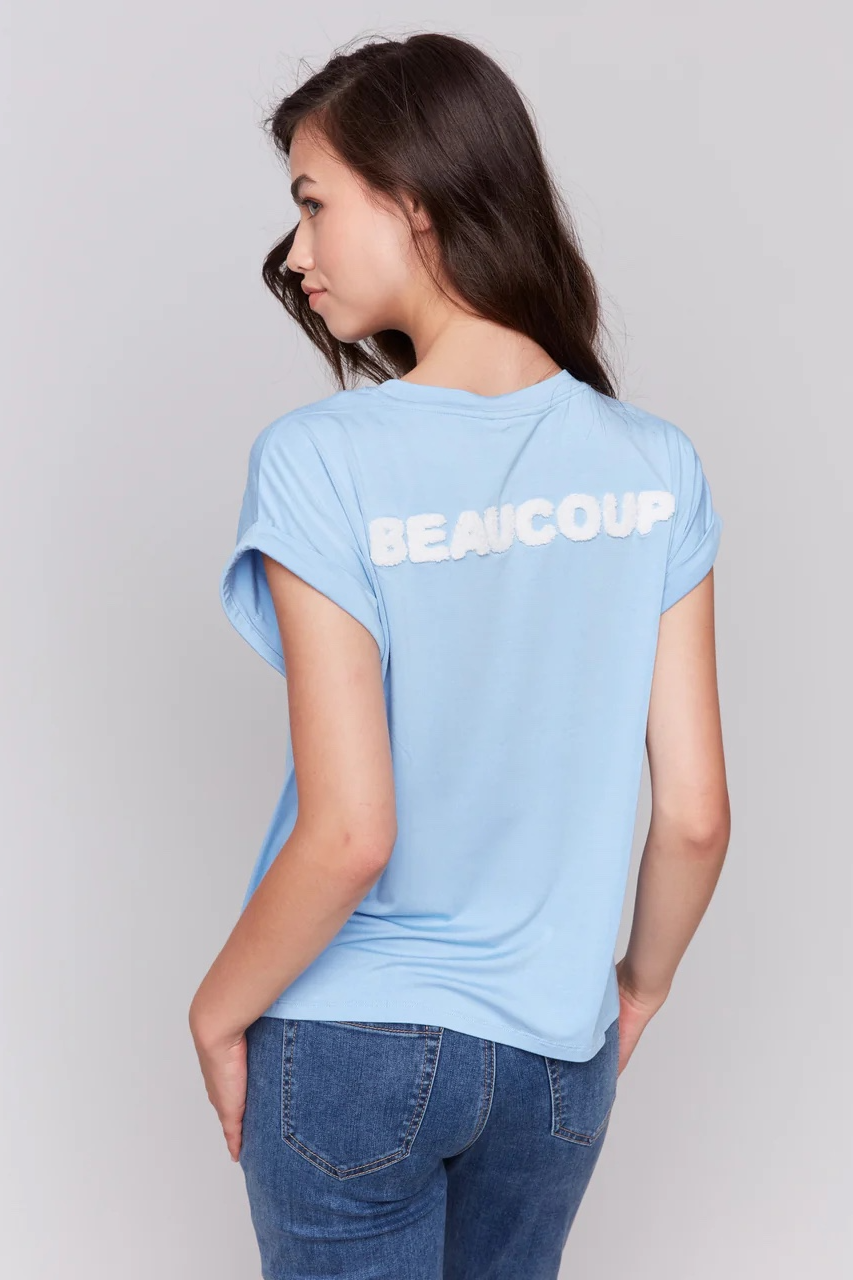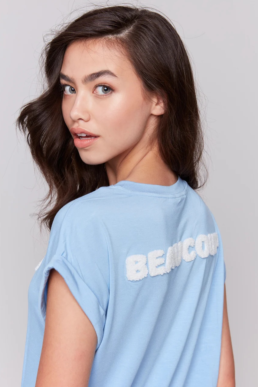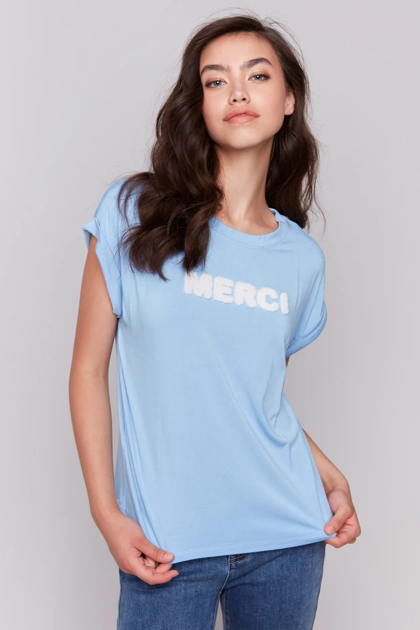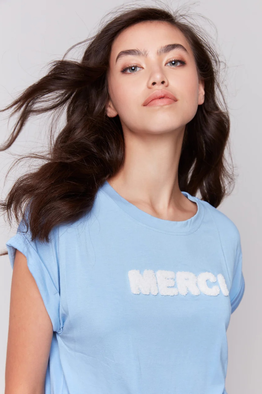 Meet your laid-back essential, the appliqué 'MERCI' soft touch blue T-shirt. Short sleeves with a relaxed drop shoulder design make it a cozy companion for warm summer days. This comfy t-shirt also features rolled cuffs, adding a touch of flair to any casual outfit.