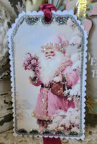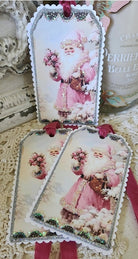 Charming vintage-style gift tags printed with a pink Santa holding roses and glittered accents. These Pink Santa N Roses Gift Tags are made for dressing presents, cards, or holiday crafts with a romantic, old-world feel. The set is created by Little Hearts Designs and features scalloped edges, ribbon ties, and sparkly detailing for a delicate finishing touch.