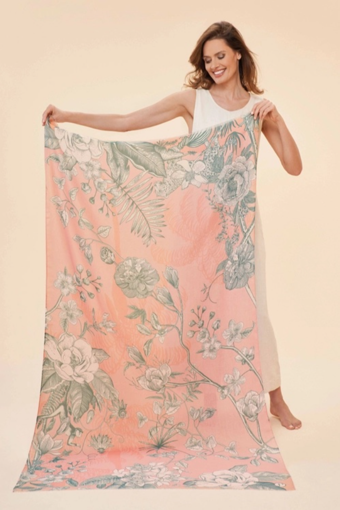 Divinely feminine! Introducing our newest print scarf design, Floral Jungle in petal. Filled with lovably ladylike florals and your favorite jungle friends to create a high-end dreamy look. The perfect scarf for the free-spirited and elegant fashionista! Style with your favorite jeans and top combo for an effortlessly chic look.