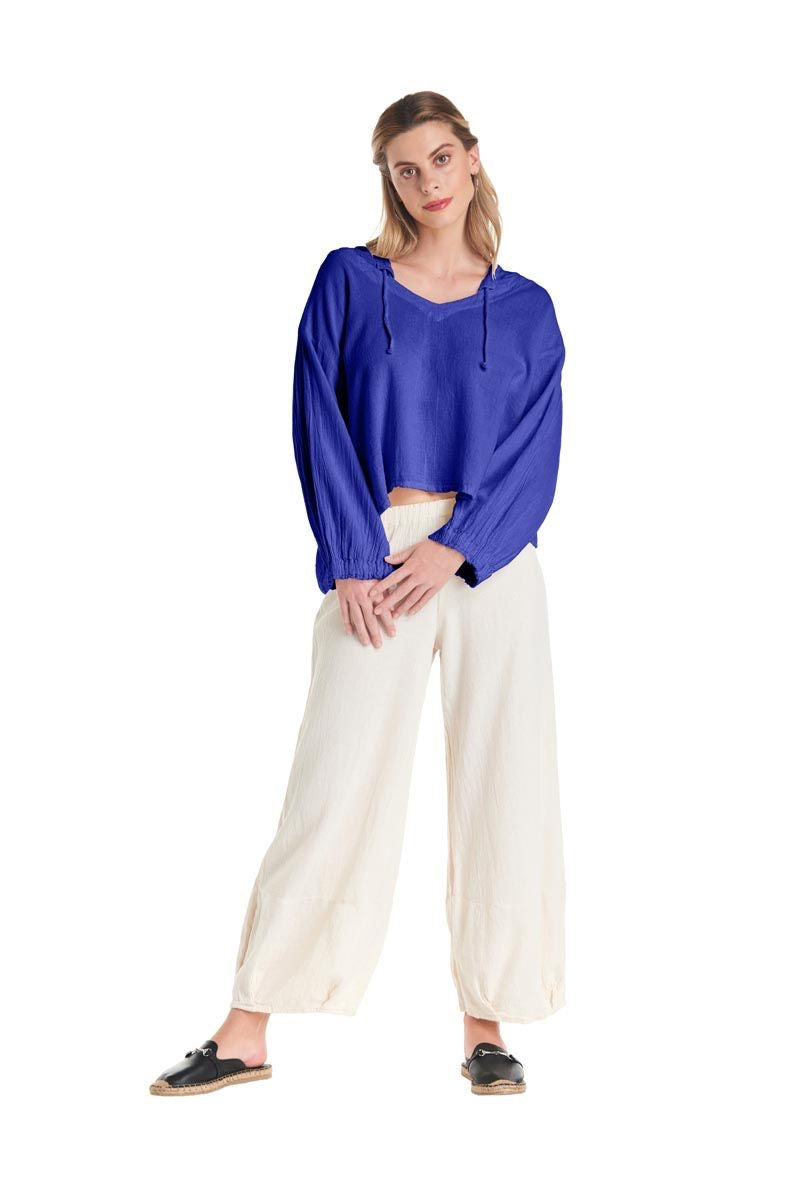 A V-neck cotton gauze top with a hood and elastic cuffs. The front hemline is shorter than the back hemline.