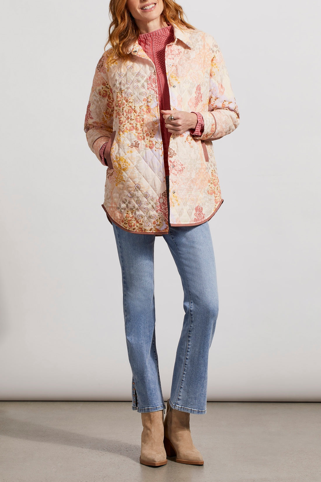 Let your authentic self shine in this vibrantly printed shacket packed with unique details to match your charming charisma. We're loving the long sleeves, button-up design with a shirt collar neckline, fully lined interior, snap closures with a matte blush finish, shirttail hem, functional welt pockets, and faux suede trim.