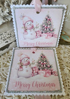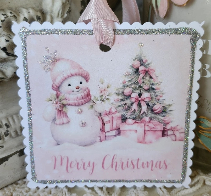 A festive snowman gift tag printed with soft pinks, glitter accents, and a scalloped edge for holiday packaging. The Snowman Tag is sized to dress up presents, favor bags, or holiday crafts with a charming Merry Christmas motif. Little Hearts Designs created this decorative tag with a ribbon loop and layered shimmer detail for an elegant, handmade look.