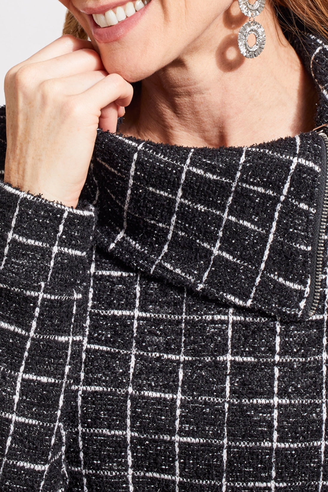 Long sleeve split neck top with zipper.