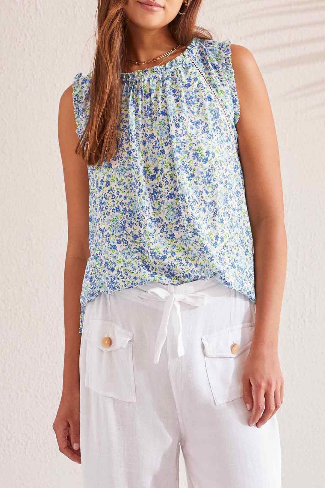 Designed with a fresh floral print, this sleeveless blouse takes your style to centerstage. We love the frilled edge at the neckline and armholes, crochet trim at the yoke, and lightweight jacquard fabric that feels airy all day long.