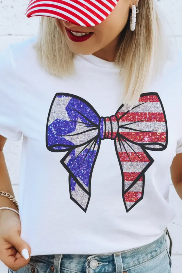 The centerpiece of the design is a vibrant red, white, and blue bow, proudly showcasing the colors of the American flag. The sublimation printing technique ensures that the colors stay bold and vivid, wash after wash, without sacrificing the shirt's softness or breathability.