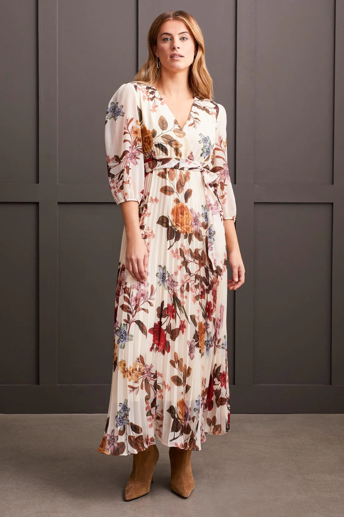 Wrap yourself in elegance with this V-neck maxi dress featuring printed Georgette fabric, a single snap closure in front, a flowy skirt, three-quarter sleeves, a 54" length, a lined interior, and a removable fabric belt.