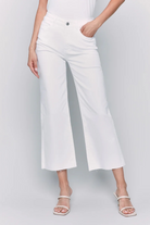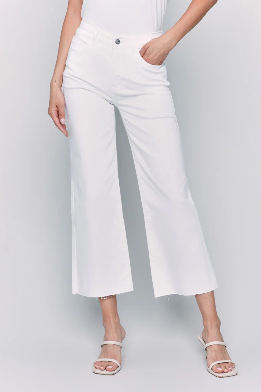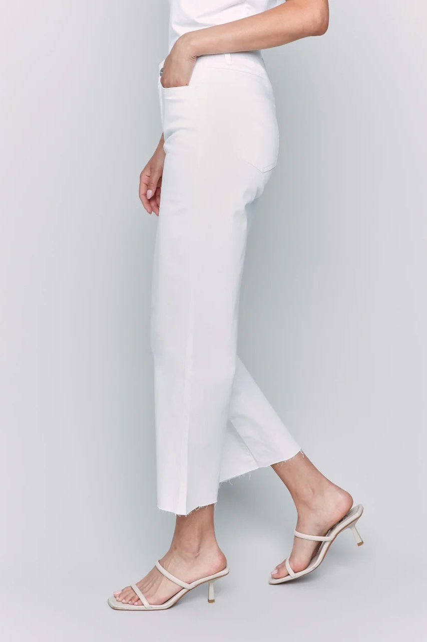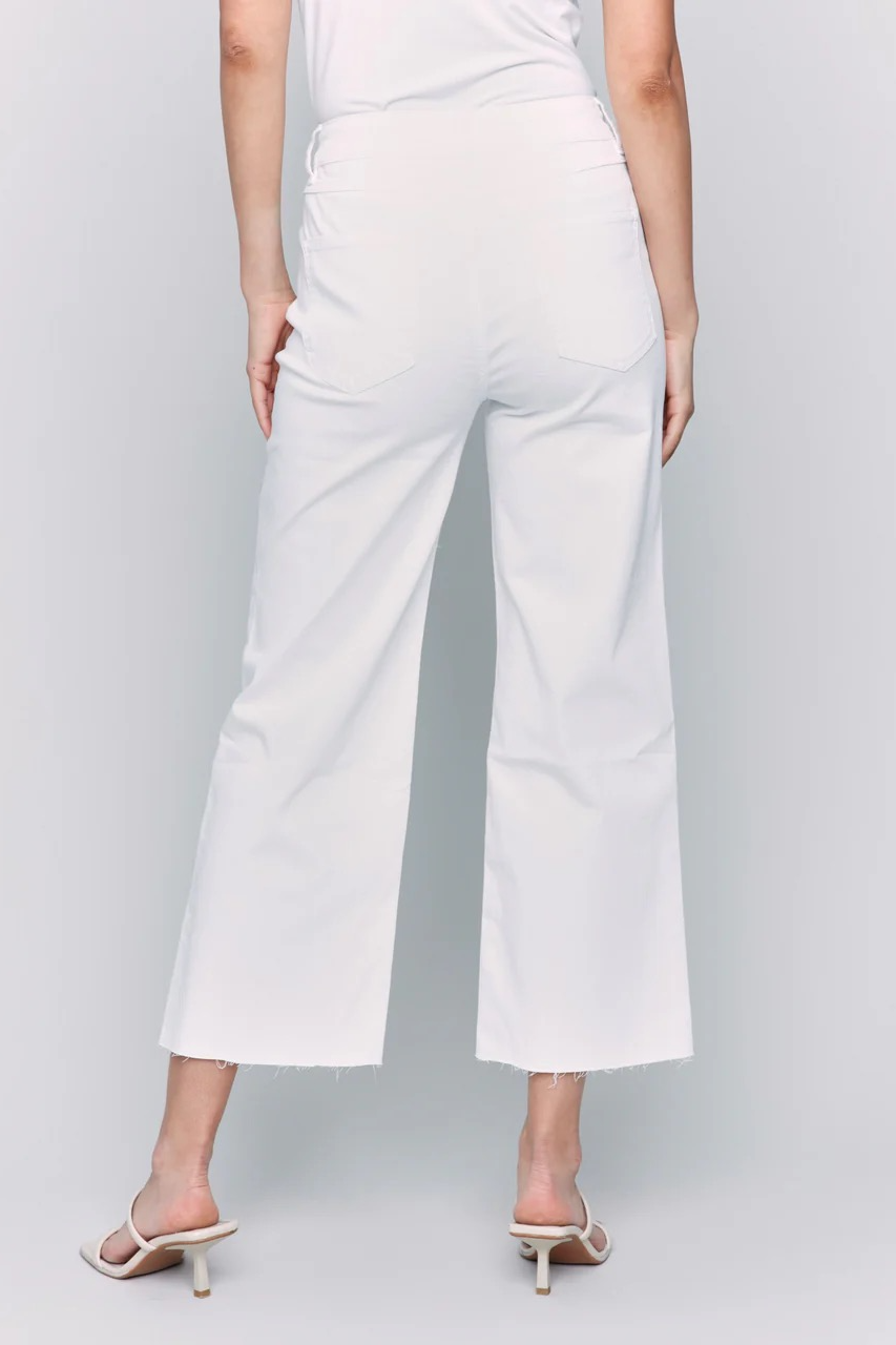 Add a touch of sophistication to any outfit with these petal pink twill wide leg pants. Featuring a raw edge and a cropped fit, they are both chic and versatile. Perfect for dressing up or down, these pants will become a staple for your everyday wardrobe this spring!